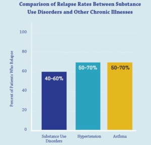 The relapse rates for substance use disorders are estimated at 40%-60%, which is similar to those for the chronic illnesses of high blood pressure and asthma. This comparison is made to show that addiction relapse is not unique among medical diseases.