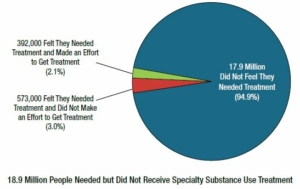 I would like to share data from the 2018 National Survey on Drug Use and Health. You can draw your own conclusions from the results. As you can see, almost 95% of those who needed specialty addiction treatment did not believe that they actually needed it. Specialty treatment refers to SUD treatment at a hospital, a rehabilitation facility (residential or outpatient), or a mental health center. The need for such treatment was indicated by the severity level of the respondent’s addiction. Respondents came from three age groups, with 25% being adolescents aged 12-17, 25% being young adults aged 18-25, and 50% being adults aged 26 or older.
